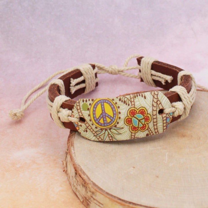 Groovy vibes only. This retro peace sign and flower printed leather pull bracelet brings back the '60s spirit with bold blooms and vintage flair. Made with comfy faux leather and an easy adjustable pull cord, it's the perfect boho accessory for music fests, chill days, or making a peace-loving statement wherever you go. Far out and flower-powered!