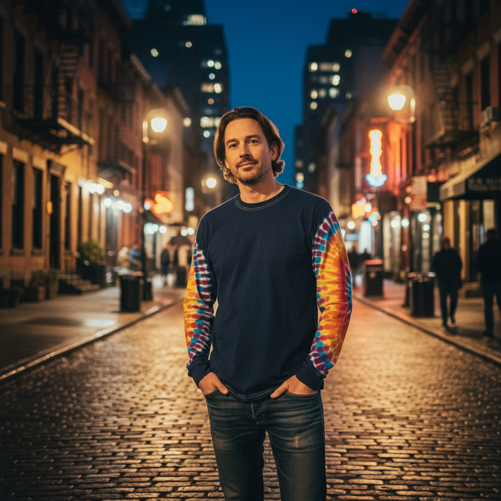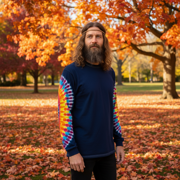 Perfect for the dye lover in your life, this tee featuring a neutral navy base and a chromatic circle of psychedelic dye on each sleeve has just the right amount of color for a cool, laidback look. Dyed using super vivid fiber reactive dyes by a team of artists right here in the USA, this trippy long sleeve tee is sure to stay vibrant for years to come.