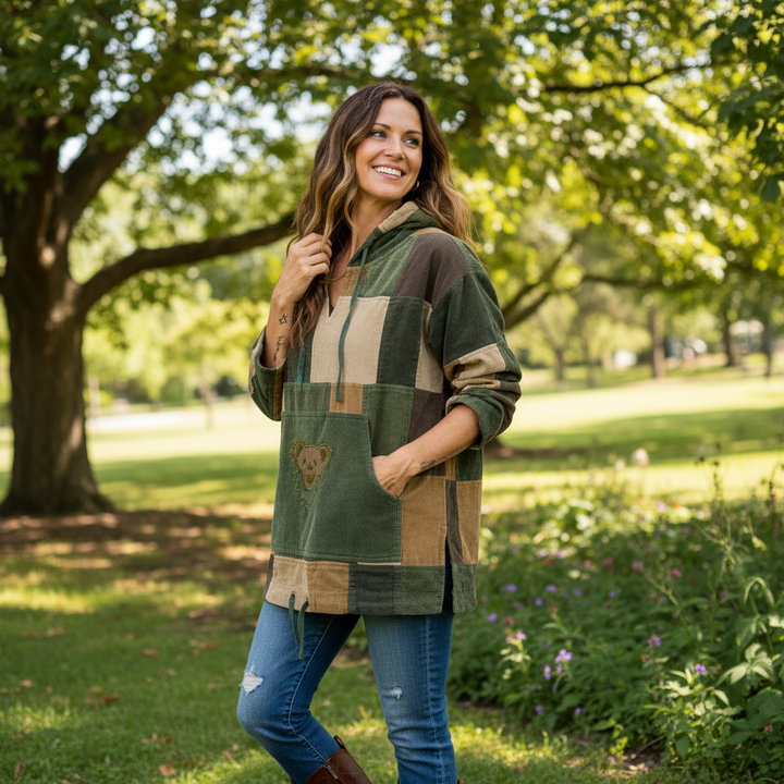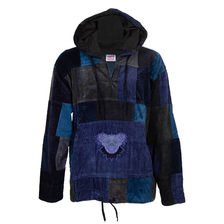 The spirit of the Grateful Dead shines in this hand-crafted corduroy Dancing Bear Patchwork Hoodie featuring the iconic Dancing Bear on the front pouch pocket.
