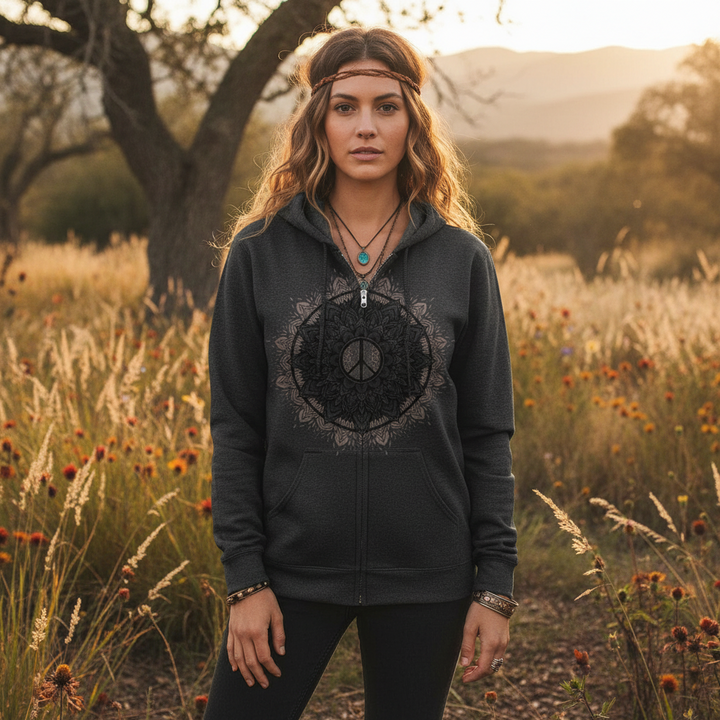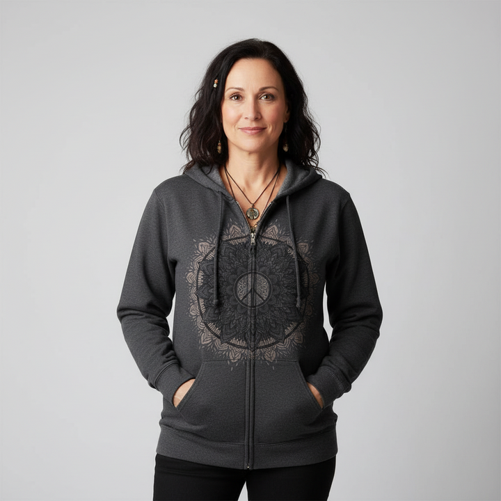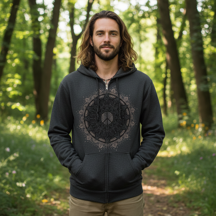 We focused our attention to the center of this mesmerizing mandala to establish our intention of bringing peace to the cosmos. This is a HippieShop exclusive, silk screened on a comfy smoke grey zip front hoodie with two front hand pockets and a drawstring hood.