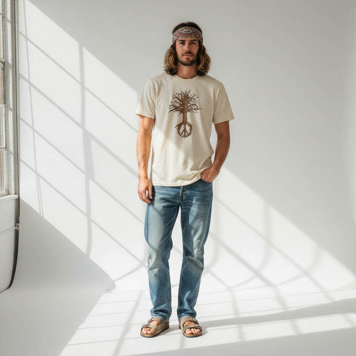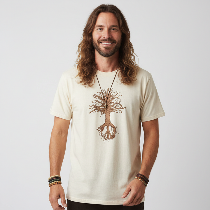 This natural colored t shirt is screen printed with a beautifully illustrated composition of the Tree of Life, growing its roots into a peace sign.