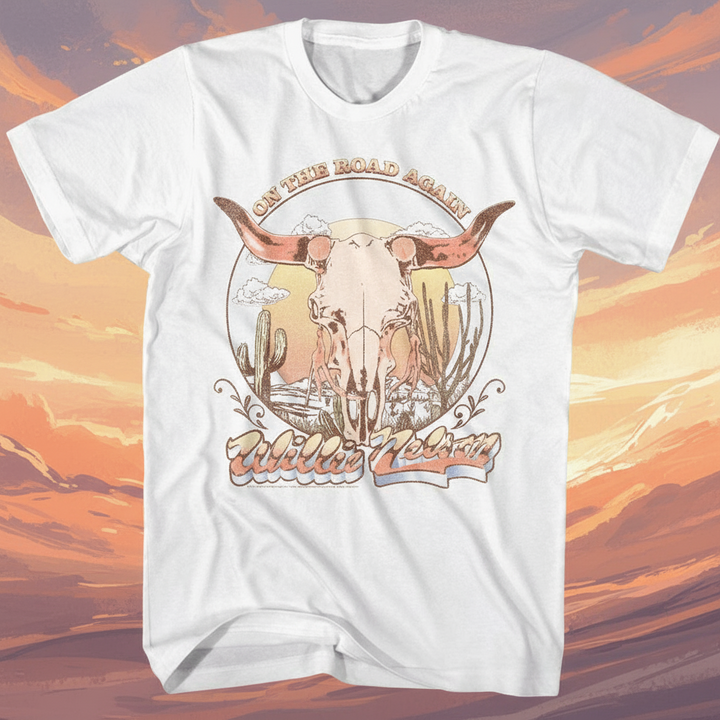 Hit the highway in true outlaw country style with our Willie Nelson "On The Road Again" Skull T-Shirt, a tribute to one of Willie’s most iconic songs and his freewheeling spirit. Set on a clean white tee, this design features “On The Road Again” arched proudly across the top, framing a bold desert landscape that captures the rugged beauty of the open road. In the center, a longhorn skull anchors the artwork, flanked by cactus, clouds and a setting sun casting warm tones over the dusty landscape. It’s a vintage-inspired design that feels like a postcard from the American Southwest, sun-soaked, timeless, and full of soul.