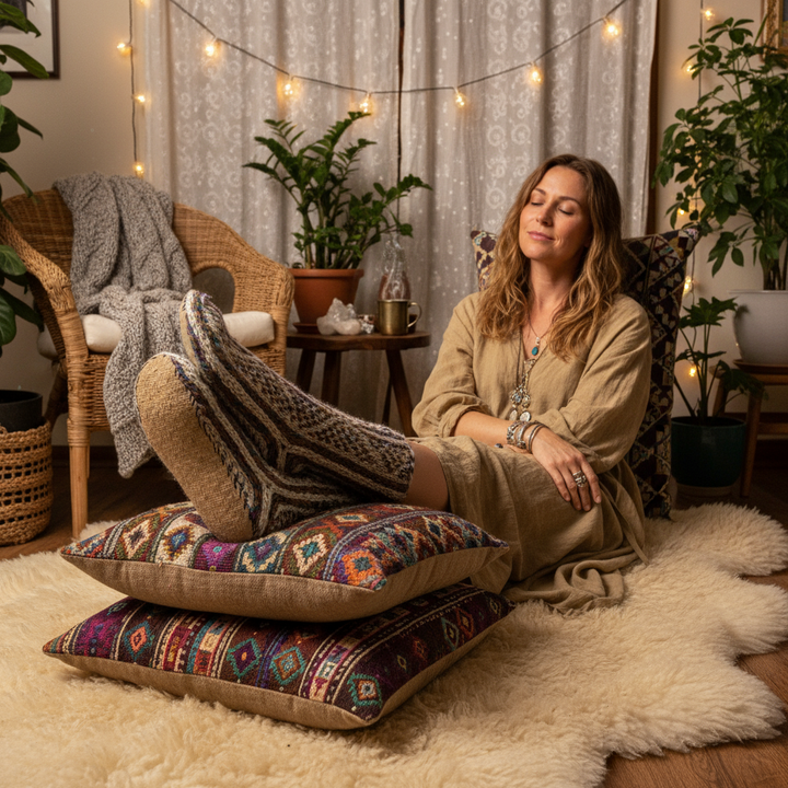 These ultra-warm wool slipper boots are perfect for keeping you warm and comfortable around the house. Features a leather sole and unique, woven wool patterns.
